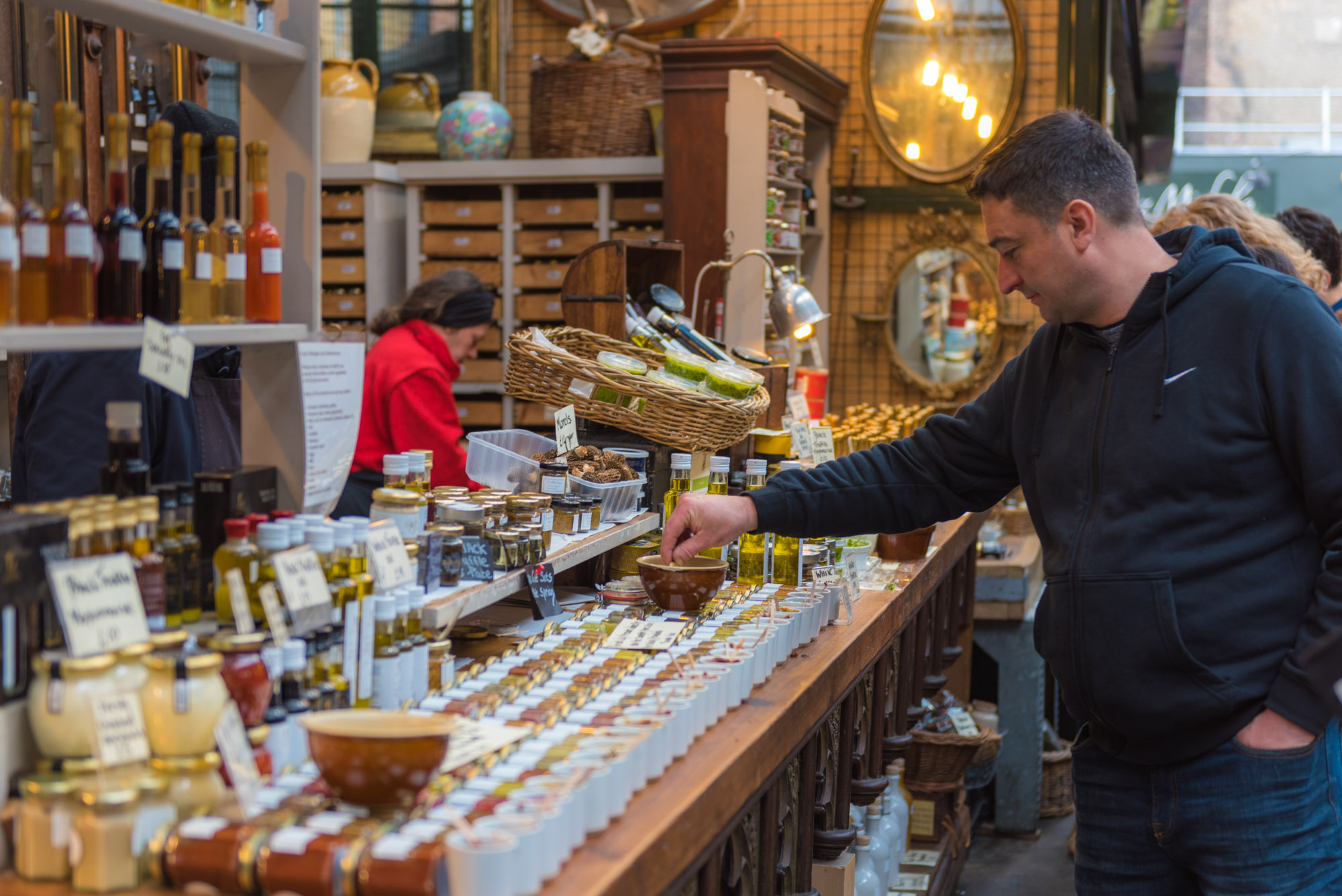 Man tasting food at Borough Market, London.